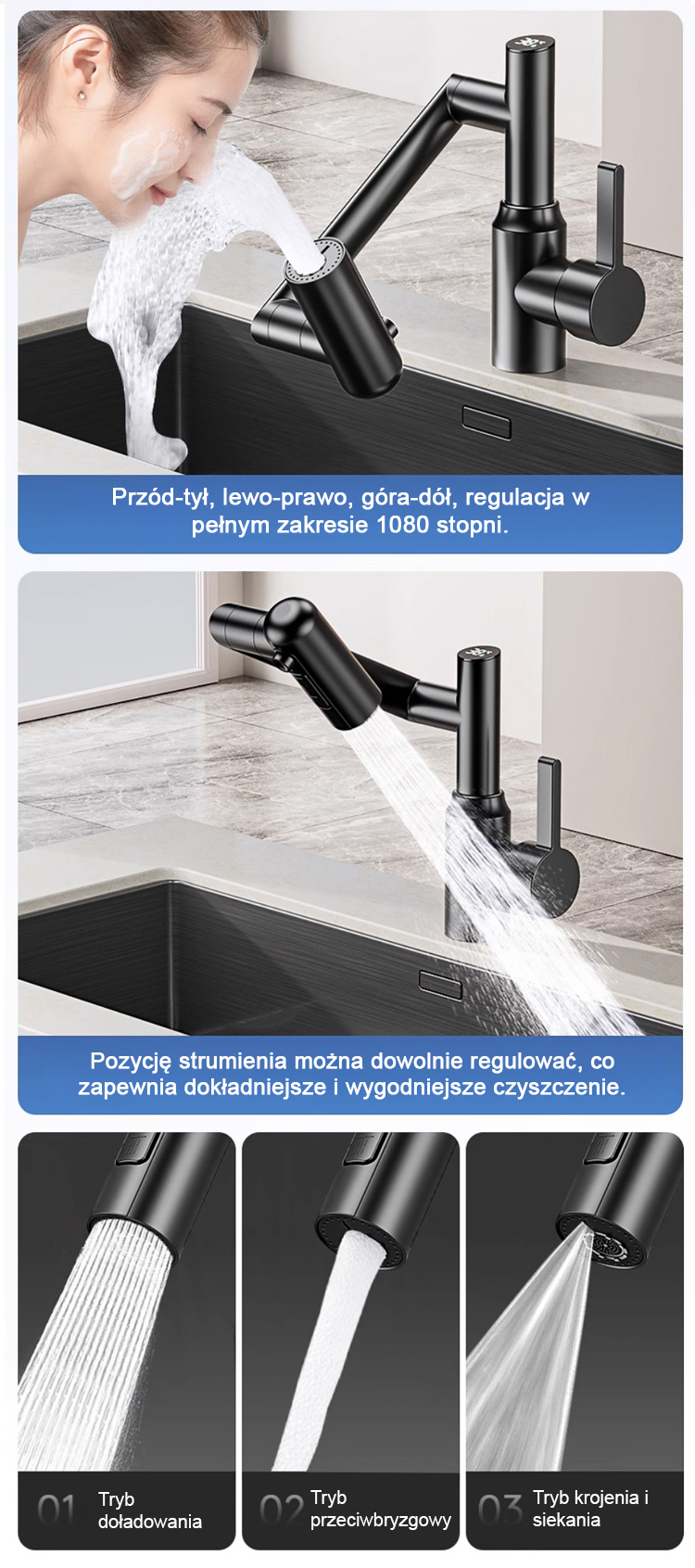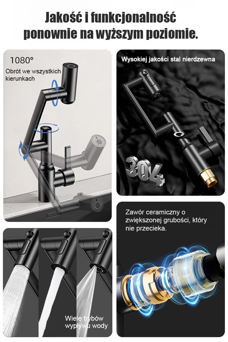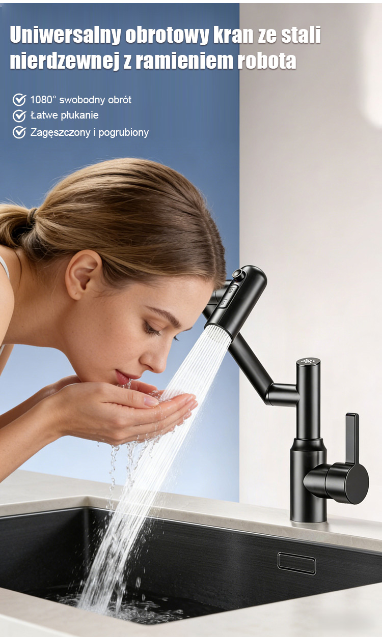 Kran robotyczny z obrotowym ramieniem 1080°. Swobodnie obracany strumień wody ułatwia mycie.