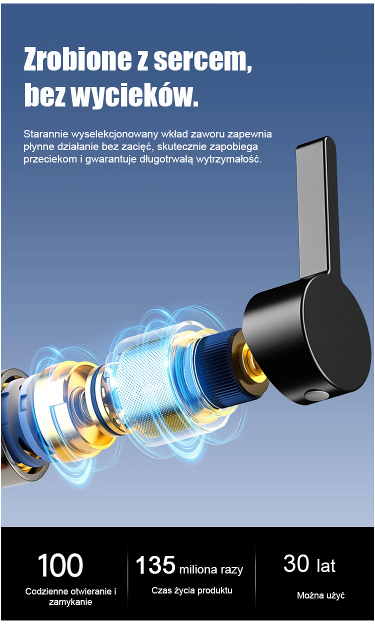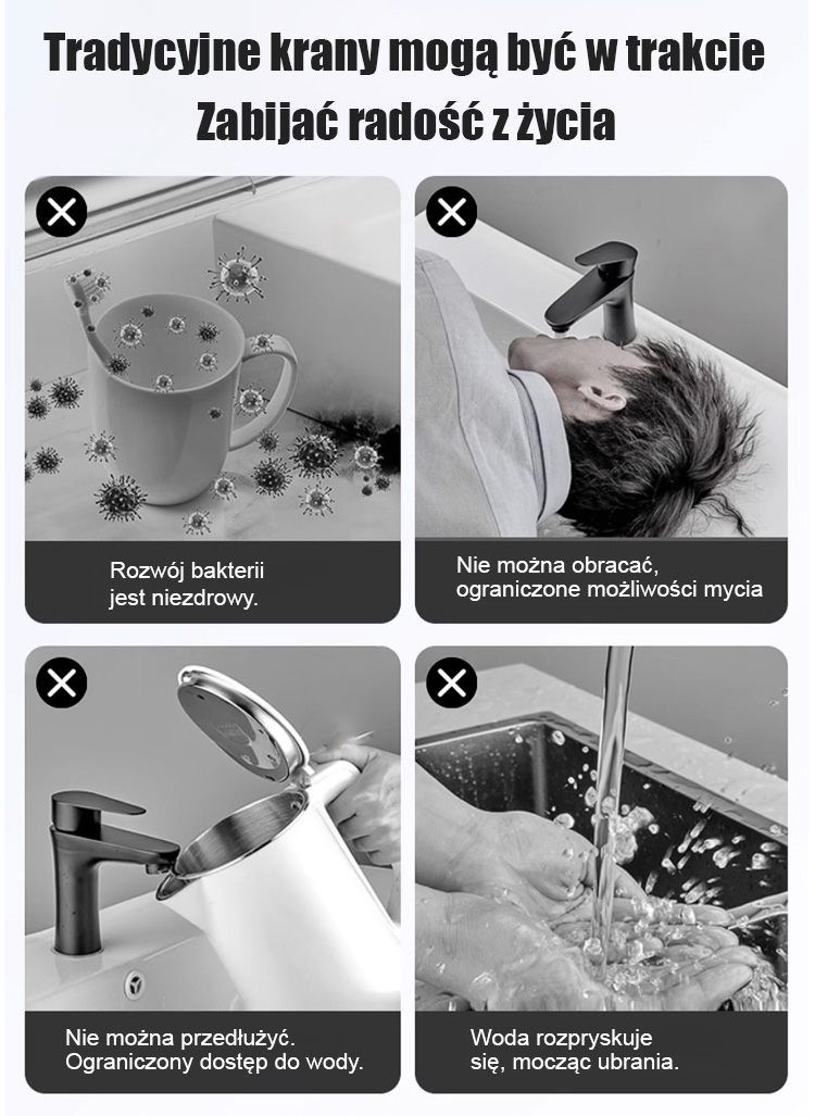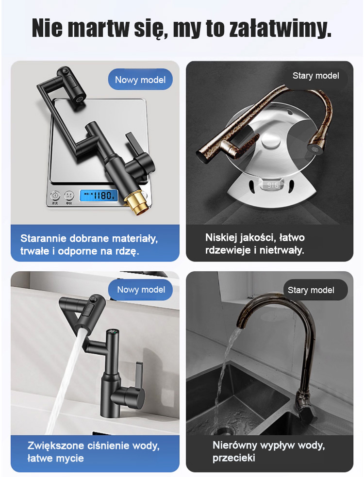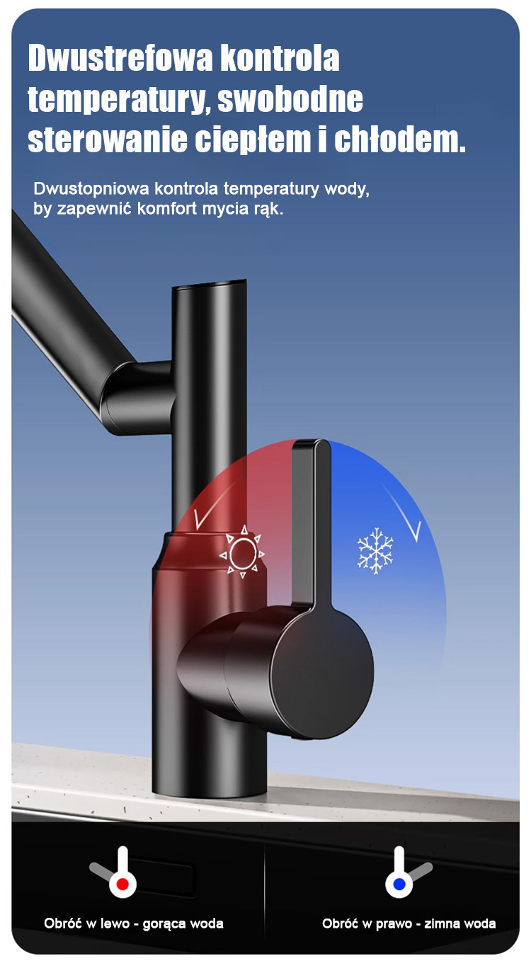 Kran robotyczny z obrotowym ramieniem 1080°. Swobodnie obracany strumień wody ułatwia mycie.