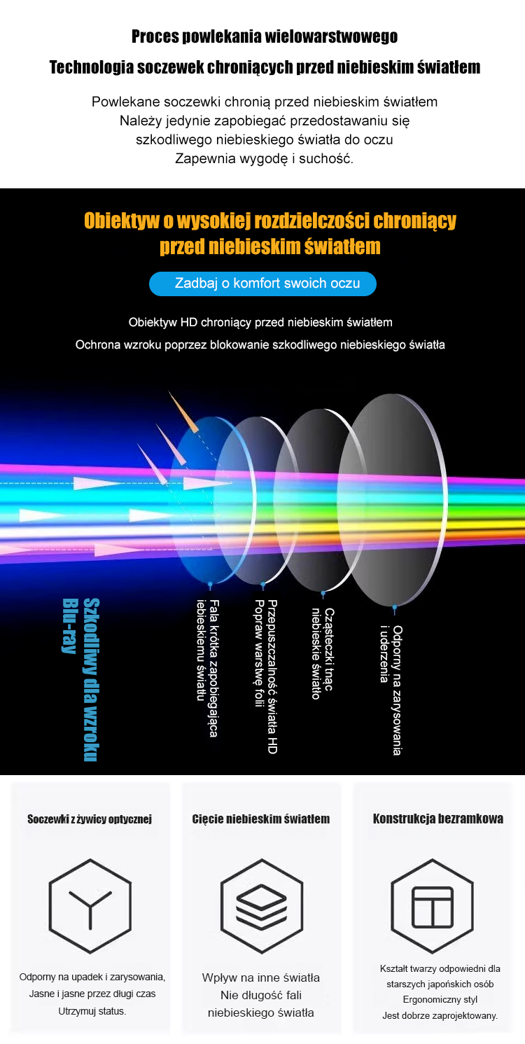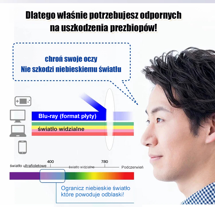 Automatycznie dostosowuje się w zakresie od 0 do 700 stopni i blokuje 99% szkodliwego krótkofalowego światła niebieskiego. Idealne do czytania i chodzenia.